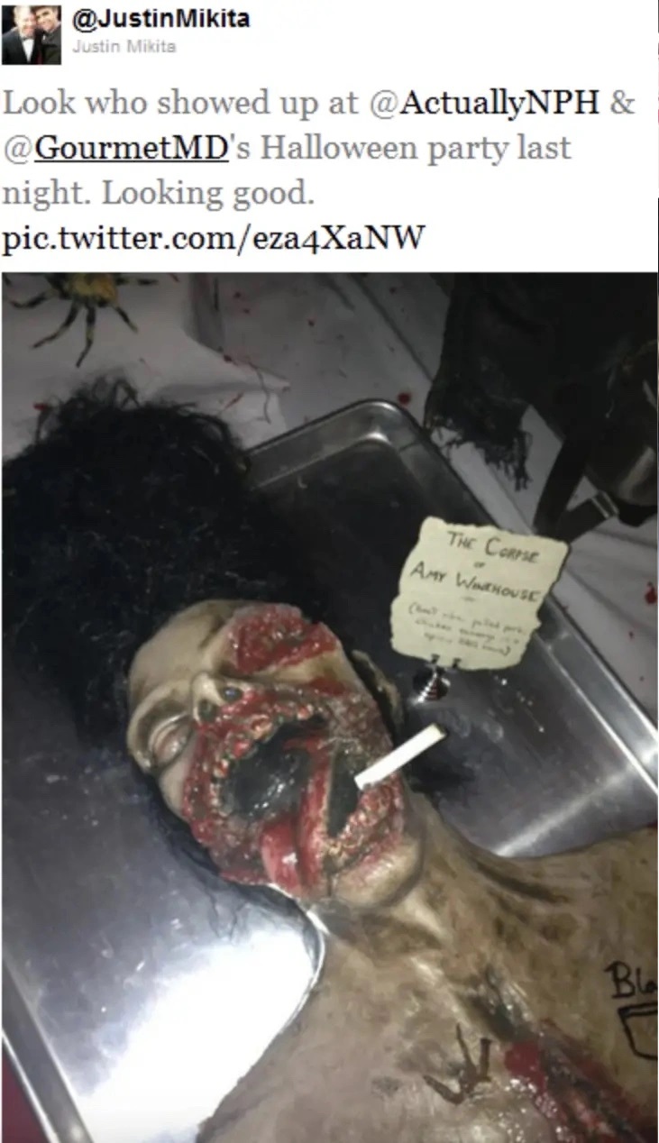 Harris pareiškime „Entertainment Weekly“ sakė: „Neseniai pasirodė nuotrauka iš Helovino vakarėlio, kurį su vyru surengėme prieš 11 metų. Buvo gaila ir tada, ir dabar.“ Aktorius tęsė: „Amy Winehouse buvo unikalus talentas ir atsiprašau už bet kokią traumą, kuri atsirado dėl šios nuotraukos“.