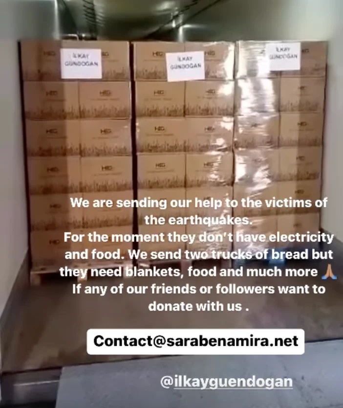 Taigi jis su žmona Sara nusprendė nusiųsti duonos į krizės zoną. „Siunčiame savo pagalbą žemės drebėjimo aukoms“, – rašė Sara Gündoğan (28) „Instagram“ istorijoje, kurioje buvo matoma kartoninės dėžės vilkike.