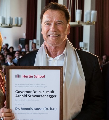 Berlin. Buvusiam Kalifornijos gubernatoriui ir Holivudo žvaigždei Arnold Schwarzenegger (77) Berlyne suteiktas garbės daktaro vardas. „Terminator“ žvaigždė asmeniškai pasirodė ceremonijoje antradienį (17.09) privačioje Hertie mokykloje.