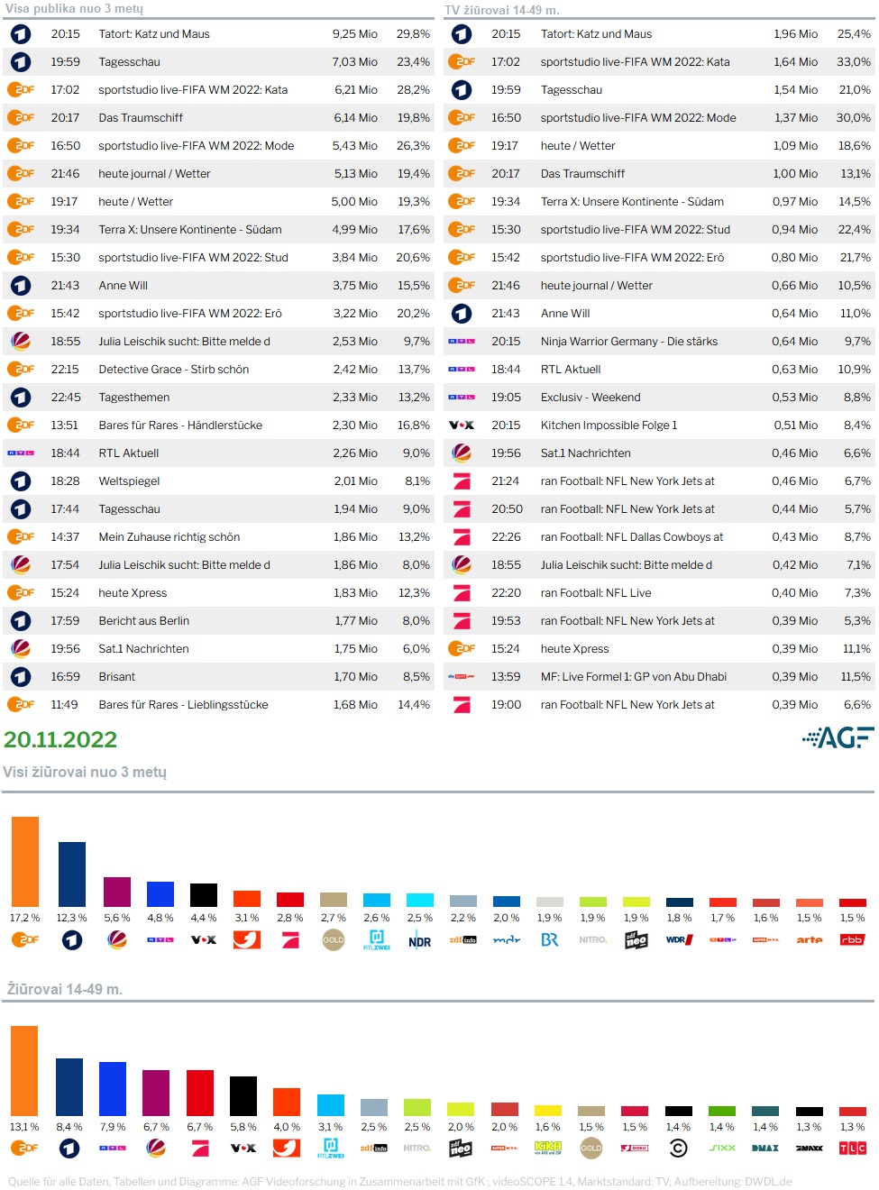 Be to, tik 1,64 milijono žiūrovų nuo 14 iki 49 metų stebėjo startą dykumos valstybėje. Tai atitinka 33 proc. rinkos dalį. Prieš ketverius metus Rusijoje vykusio pasaulio futbolo čempionato atidarymo rungtynes šioje amžiaus grupėje stebėjo 3,3 milijono žiūrovų, tuo metu užėmusią daugiau nei 50 procentų rinkos.